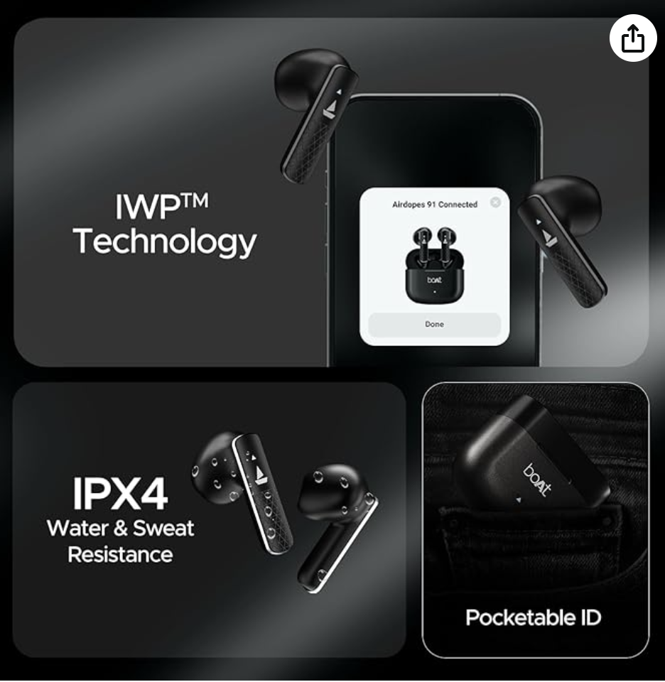 • ASAP Charge: Airdopes 91 Prime is your movie marathon partner for the long haul with its fast charging which lends a whopping 120 minutes of playtime when you charge the earbuds for just 10 minutes.